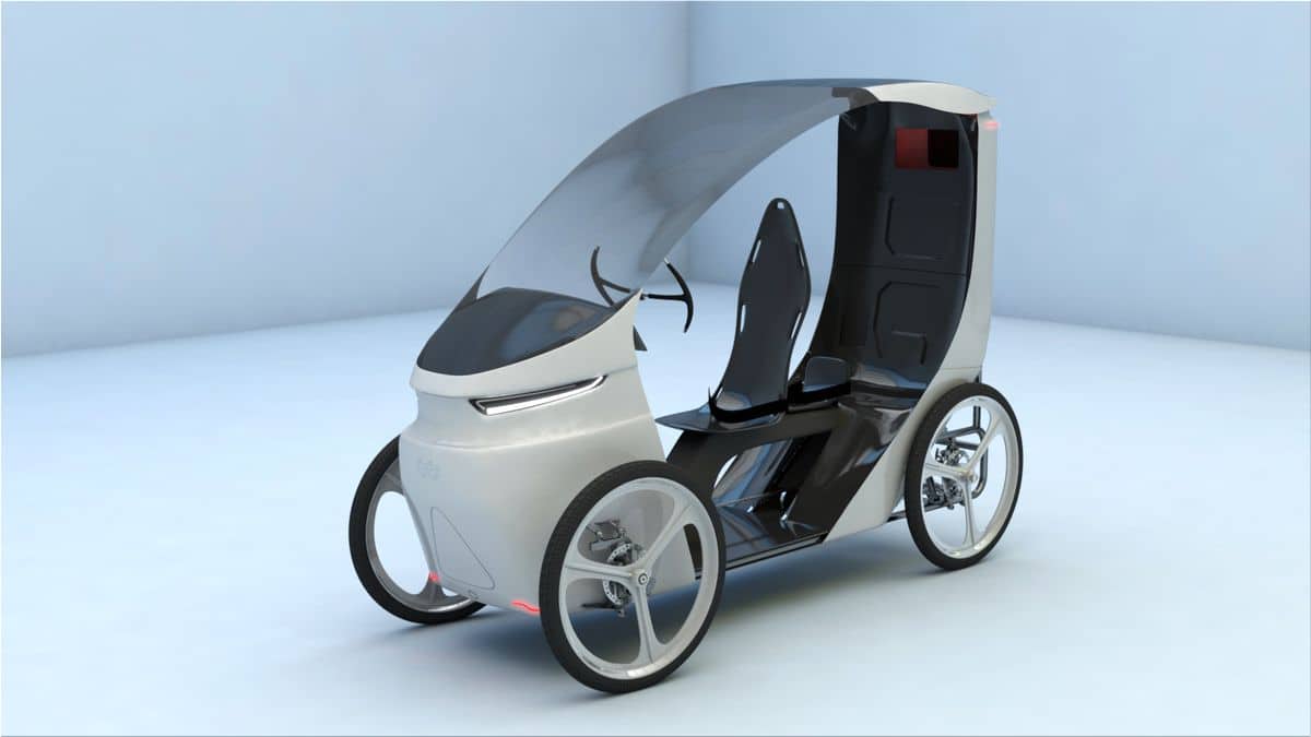 La bicicleta eléctrica de cuatro ruedas está tecnológicamente adaptada para todas las condiciones climáticas. Cuenta con un sistema fotovoltaico en el techo que asegura la recarga de las baterías de tracción y suministra el control del vehículo electrónicamente.